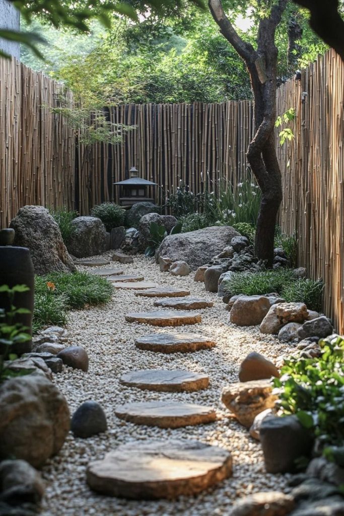 Piedras locales, madera recuperada, grava, musgo y sombras suaves crean espacios serenos donde la estética no grita: permanece.